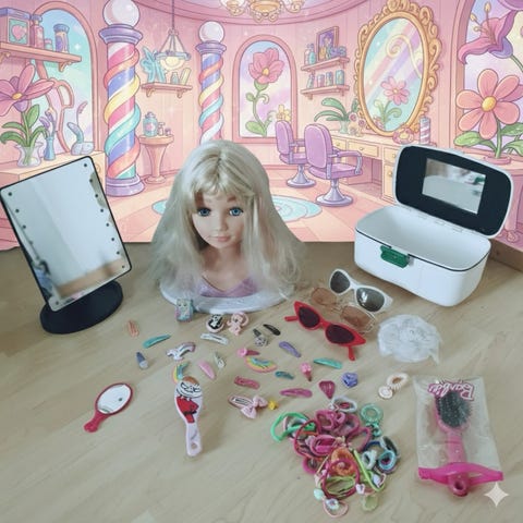 Barbie kampauspää varusteineen ja kampaamotuoli myynnissä.