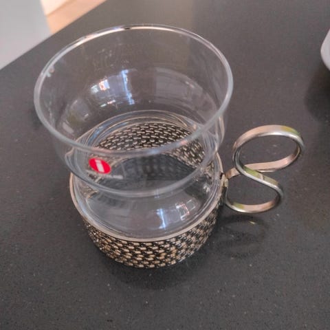 Kuvan käytetty kirkas Iittala Teema-sarjan ryyppylasi, jossa pieni halkeama.