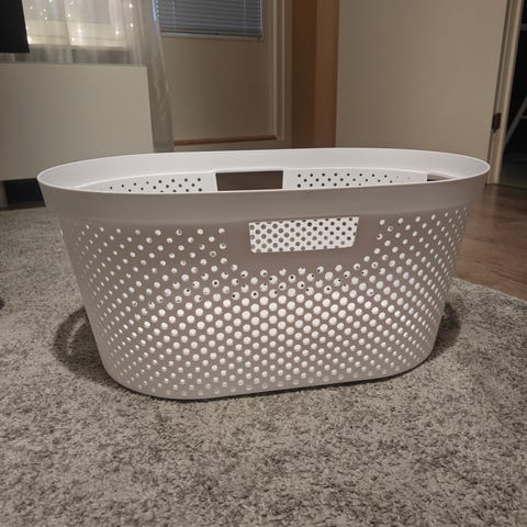 IKEA pyykkikori, valmistettu muovista. Väri beige. Kori on suorakaiteen muotoinen ja siinä on saranoitu kansi. Kyljissä on kahvat siirtämistä varten. Soveltuu pyykin säilytykseen tai muuhun kodin säilytyskäyttöön kuivissa sisätiloissa.