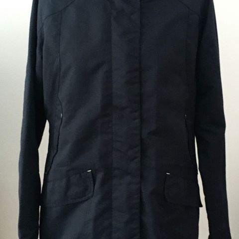 Kiristys takana, ja sivuissa. Hupun saa kauluksen sisään.