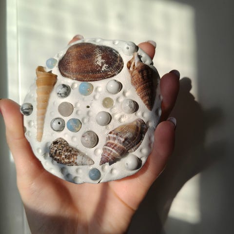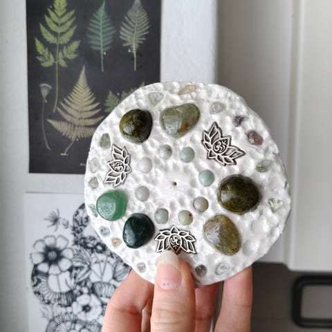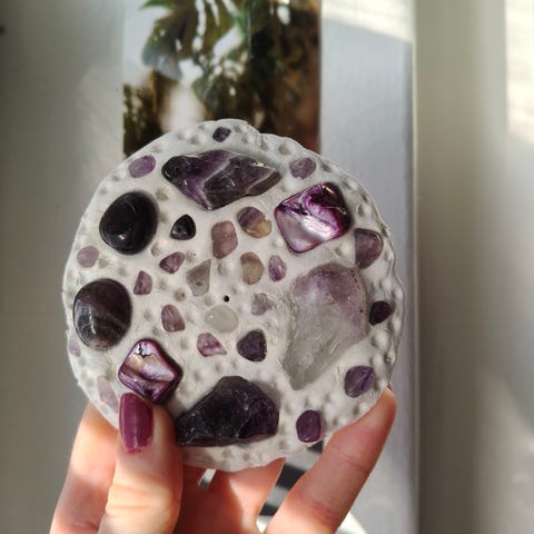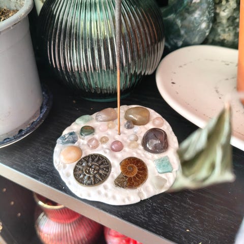 Aidoilla kristallikivillä ja simpukalla koristeltu suitsuketeline 🐚