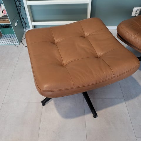 Hyväkuntoinen Joel bonded-nahkarahi, jossa wengen väriset jalat. Rahin tyyny on kiinteä eikä sitä voi irrottaa. Mielellään nouto.
