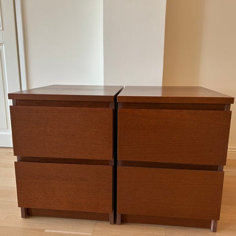 Tukeva lipasto/yöpöytä kahdella laatikolla. Käytössä kulumia.