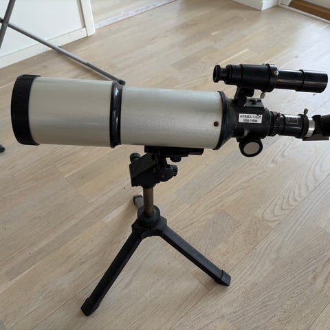 TeleScience astronominen kaukoputki, optinen aukko 50 mm ja polttoväli 600 mm (f/12), okulaarin halkaisija D-40 mm. Putki on asennettu kolmijalkaiseen jalustaan, jossa on puujalat ja säädettävä kiinnike. Soveltuu tähtitaivaan ja kaukaisten kohteiden tarkkailuun. Runko ja säätönupit ovat muovia ja metallia, väriltään sininen ja vaalea. Kaukoputki on manuaalisesti suunnattava ja tarkennettava.