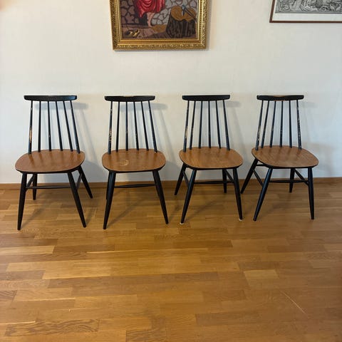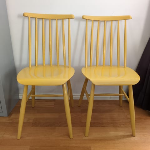 Mukaan saa halutessaan vielä 2 samanlaista pinnatuolia, jotka vaativat kunnostusta. Toisesta yksi pinna poikki selkänojasta ja molemmat tuolit vaativat liimausta. Nämä mukaan ilmaiseksi, mikäli löytyy innostusta kunnostamiseen.