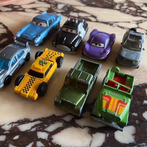 Tästä seuravalle leikkijälle disney the cars pikkuautoja. 6 metallista ja kaks muovista. Leikkimisen jälkiä tietenkin osassa on. Muovisista autoista punaisesta keulasta pieni pala pois.