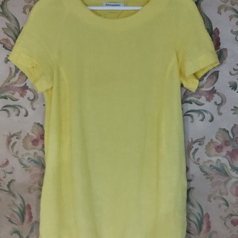 Hihaton mekko 100 % pellavaa. Käytetty lähinnä juhlissa, hyvä arkimekko edelleen. Pitkä vetoketju takana, muotolaskokset rintojen kohdalla ja taskut sivusaumassa molemmin puolin. Kauluksen lähellä pellavakankaalle tyypillinen "lankanyppy" ja kauluksen takareuna oli n. sentin purkautunut, jonka ompelin siististi kiinni. Näistä on kuvat.