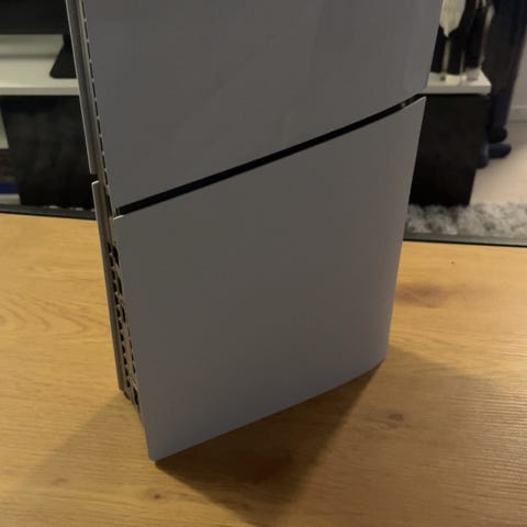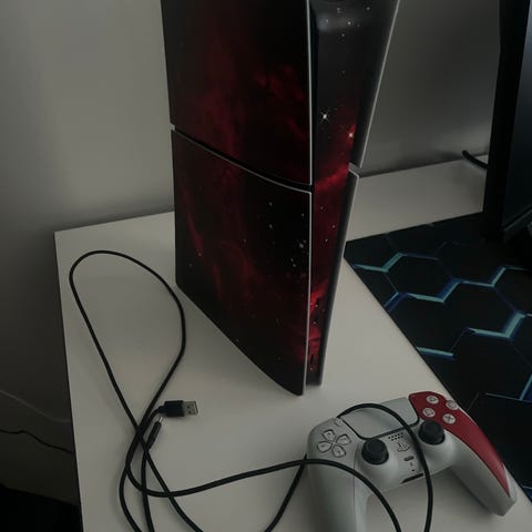PS5-konsoli levyasemalla ja kaksi ohjainta. Toimii moitteettomasti, säilytetty sivuttain.