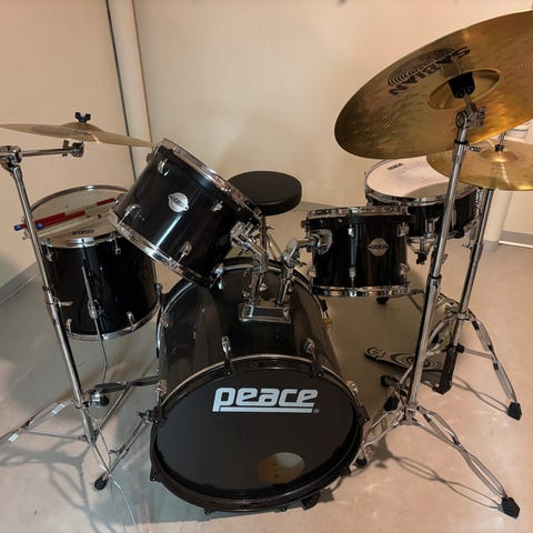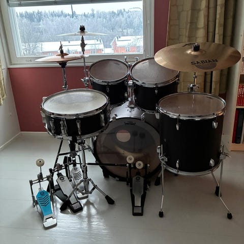 Valkoinen rumpusetti, jossa useita tomeja, virveli, bassorumpu sekä symbaaleja ja hi-hat. Settiin kuuluu myös pedaali ja rumpukapulat sekä lehmänkello. Virveli juuri huollettu F-Musiikilla. Hyvä perus setti!