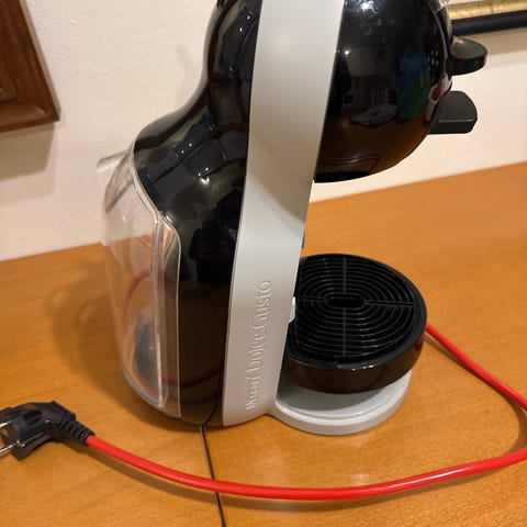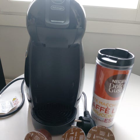Myydään De'Longhi Nescafé Dolce Gusto kapselikahvinkeitin. Väri musta/harmaa, punainen virtajohto. Todella vähän käytetty. Laite käyttää Nescafé Dolce Gusto -kapseleita erilaisten kahvijuomien valmistukseen. Soveltuu kotikäyttöön yhden kupin kerrallaan valmistamiseen. Laitteessa on tippa-alusta kupille. Mukaan kuvissa näkyvä Nescafé -opas.
