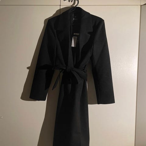 Käyttämättömäksi jäänyt villakangastakki. Säilytetty pukupussissa.
