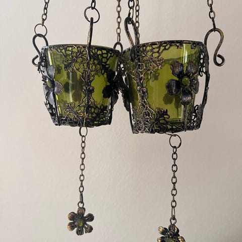 Ihanat Indiskan riippuvat kynttilälyhdyt 2kpl. Lyhdyissä on punainen lasi kuppi ja metallinen pitsimäinen kehikko kukkakoristeilla sekä ketjut ripustamista varten. Pohjassa roikkuu ketjussa kukkamuotoinen koriste. Sopii esimerkiksi tuikku- tai pienten kynttilöiden polttamiseen. Kokonaispituus 65cm.