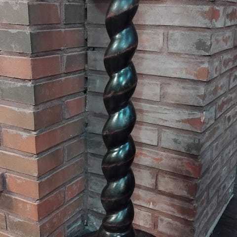 Kaunis tumman ruskea puinen, tyylikäs kukkapylväs hienolla koristeella (vanha antiikkia") alatason alareunassa. Pylväässä paikka kahdelle kukalle. Tasot 22 x 22 cm. Pylvään korkeus 89 cm. Jalat viistossa, tekee pylväästä myös tukevan!