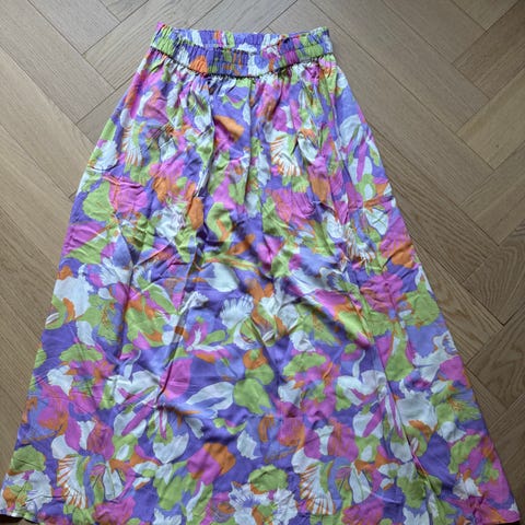 Milk Copenhagenin M- kokoinen, nilkkapituinen hame. Beigellä pohjalla ruskea kukkakuvio. Helmassa pieni rypytys.