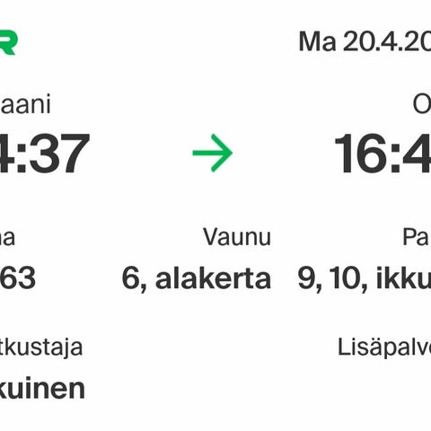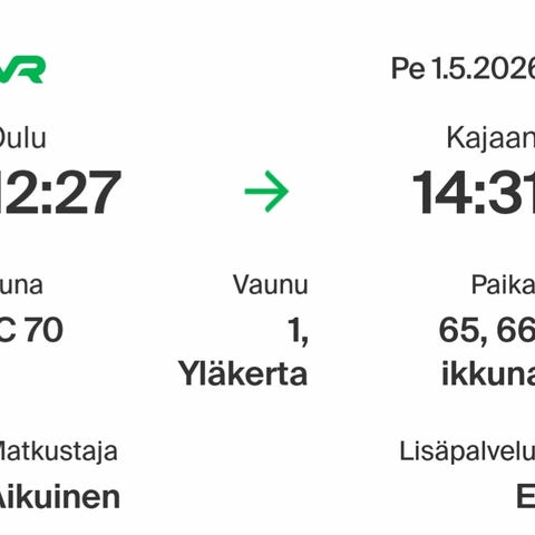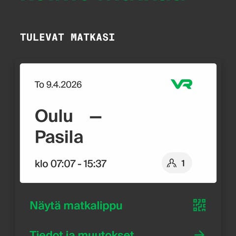 VR Opiskelija junalippu Pasila - Tampere - Oulu 8.4.2026