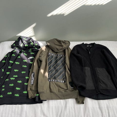 Yhdessä hupparissa pieni tahra, ks. viimeinen kuva (voin jättää halutessa hupparin pois paketista)