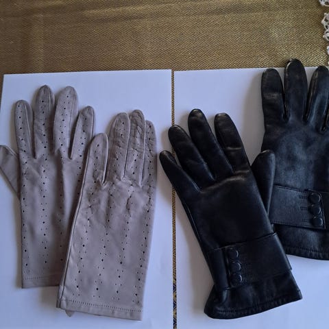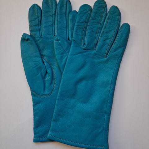 Nahkaiset naisten käsineet koossa 6,5. Väri sininen. Materiaalina sileä nahka, sisäpuolella kangasvuori. Sopivat arki- ja ulkokäyttöön viileään säähän.