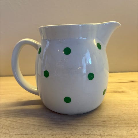 Arabia pomona omena maitokannu. Suunnittelija Raija Uosikkinen. Kannu ehjä ja särötön. Koristekuviossa pientä kulumaa nähtävissä. Kork. 16cm
