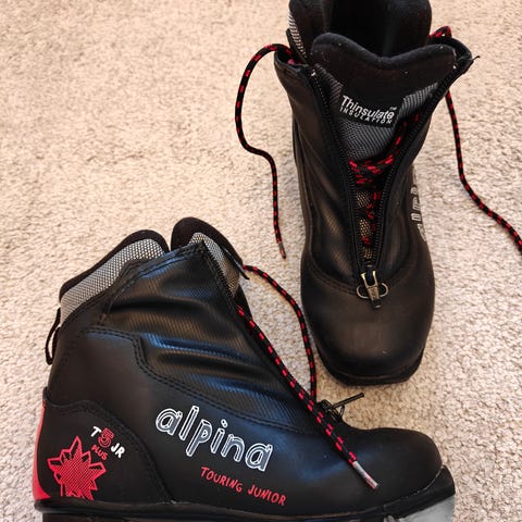 Alpina T5 Plus pertsan monot. Monoissa on nauhakiinnitys, jonka päällä vetoketjullinen suojaläppä. Sisäosassa on Thinsulate-eristys. Pohja on yhteensopiva NNN- ja Prolink-siteiden kanssa. Koko 34. Aika vähän kilometreja nähneet.