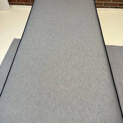 Sotka runkopatja, harmaa verhoilu. Runkopatjassa puinen runko ja joustosäleet, pohjassa näkyvissä puulistat ja vaimennusmateriaali.
