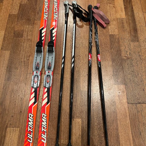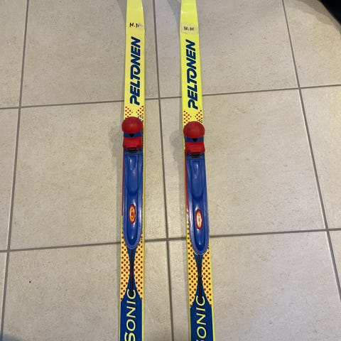 Kenkiin kiinnitettävät Peltosen sukset. Suksien pituus 90 cm. Sauvat mukaan. Pientä kulumaa suksen alapinnalla kts. kuva. Nopea nouto Viikistä.