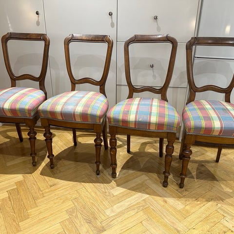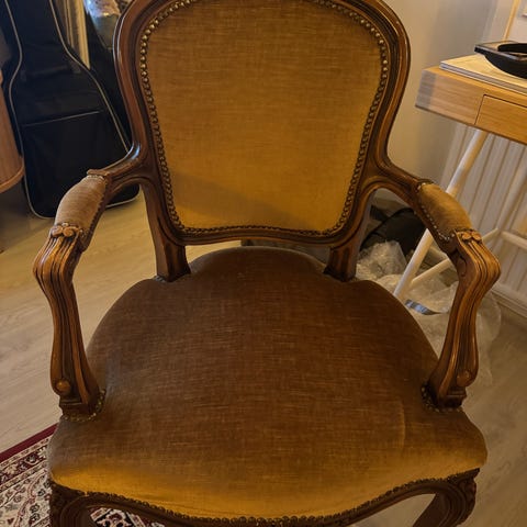 Alkuperäiskuntoinen renesanssi-henkinen, tammirunkoinen puutuoli-harvinaisuus 1800-luvun jälkipuoliskolta. Lujakuntoinen mutta kulunut: tammirunko on täysin ehjä ja tukeva, kohopainetuissa nahkaverhoiluissa normaalia nahan ikääntymistä ja kuivumista. Kaikki koristeosat ehjiä. Leveys 43 cm, selkänojan korkeus 92 cm, istumakorkeus 46 cm, syvyys 48 cm, paino n. 8 kg. Ei uusi, mutta pelastettavissa, eli löytö vaikkapa entisöintitaitoiselle! Kotiinkuljetus järjestyy samaan hintaan Tampereella ja naapurikunnissa, kysäise!