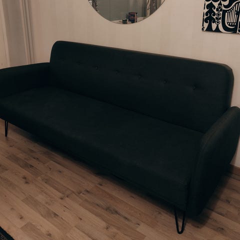 Beige vuodesohva säilytyslaatikolla. Hyvässä kunnossa, nojaosa erilliset tyynyt, tilava säilytyslaatikko, vuodesohva osio vedetään sohva alta.