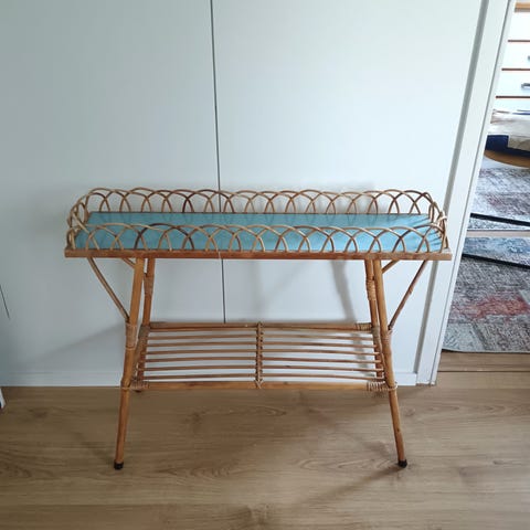 Myydään vanha rottinkinen kukkapöytä. Taso sinistä muovia/vinyyliä. Jalkojen valkoisissa suojissa halkeamia, ks. kuva. Kaikki liitokset kunnossa. Leveys 98cm, syvyys 19cm, korkeus 65cm (koristereunan yläreunaan mitattuna). Nouto Laajasalosta.