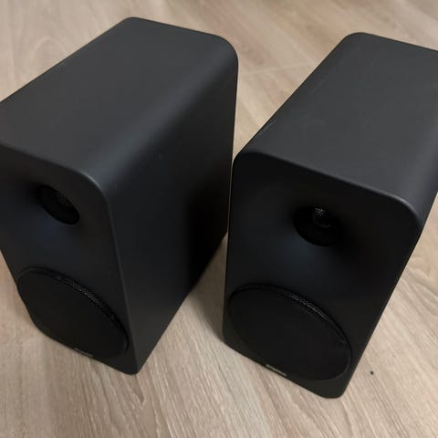 Nyt kaupan kompakti hifijärjestelmä. Lisää vain äänilähde ja nauti. Sopii hyvin esim tietokoneen tai vaikka vaan puhelimen kaveriksi. Kaikki toimii hienosti ja laitteiden kunto hyvä. Ainut moitteen kohta on kaiuttimien pohjasta löytyvät pienoiset naarmut (kts kuva).