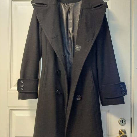 Musta villakangastakki. Koko 44. Mitat kai-kai 60cm, olka-helma 90 cm. (Menee myös koolle 42) Tekoturkiskaulus. Vyölenksut on jos haluaa jotain vyötä käyttää (ei mukana vyötä). Edessä isot taskut, yksi povitasku. 70% villaa. Siisti takki. Voi noutaa tai postitus
