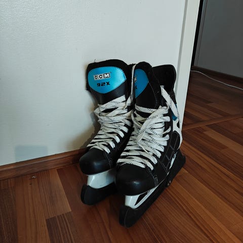 CCM jääkiekkoluistimet, koko 43 (US 8.5). Väri musta/harmaa valkoisilla yksityiskohdilla. Teräkotelo valkoinen ja terissä merkintä Performance Lite. Valmistettu Kanadassa. Sopivat jääkiekkokäyttöön tai yleiseen luisteluun jäähalleissa ja ulkojäillä.