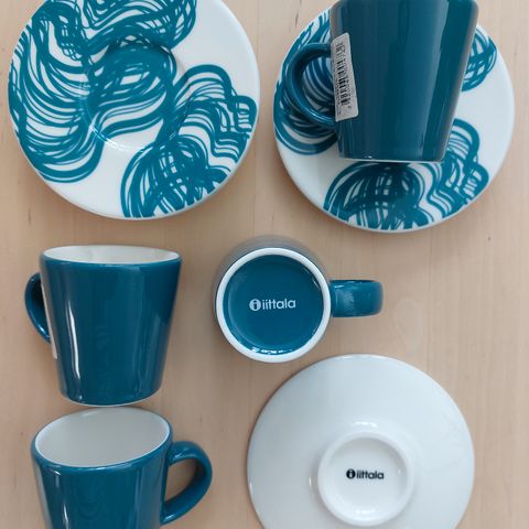 Kaksi kappaletta Iittala Aika Graphics espressokuppeja lautasineen. Siistit ja ehjät, lautasien pohjapuolella ihan aavistus kuvien mukaista käytön jälkeä.