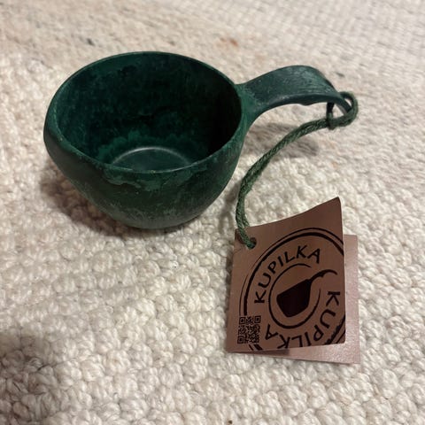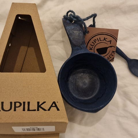 KUPILKA 5-SNAPSIKUPISTA nautit niin espresson, inkiväärishotin kuin lempiliköörisi. Kahvaan solmitun poronnahkanauhan avulla korumaisen kaunis ja siro kuppi pysyy tallessa kaulaan ripustettuna.