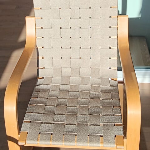 Artekin nojatuoli beige satulavyö. Tuolissa on jonkin verran käytönjälkiä. Tuoli on alkuperäisessä kunnossa talttapää ruuveilla.