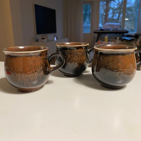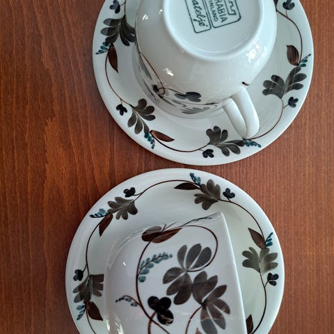 2 kpl Arabia Ateljé teekuppia ja aluslautaset, käsinmaalatut. Suunnittelija Gunvor Olin-Grönqvist. Saatu lahjaksi eikä kertaakaan käytetty. Mukin korkeus 7 cm, halkaisija yläreunassa 9 cm, tassin halkaisija 16 cm.
