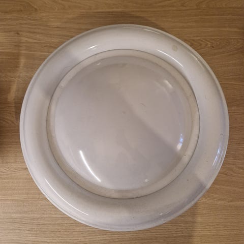 Suuri plafondi, halkaisija n. 50 cm. Kiinnitys kattokoukkuun. Suuri valaistusteho, sillä tähän menee 3 kpl e27 kannan polttimoita.
