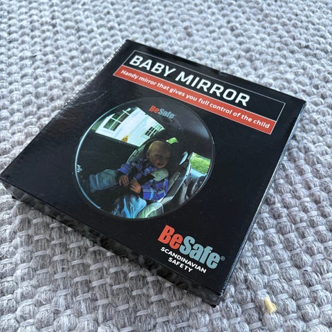 BeSafe peili autoon. Peili kiinnitetään auton takaistuimen niskatukeen hihnoilla, jotta kuljettaja voi nähdä taaksepäin selkä menosuuntaan istuvan lapsen. Peilissä on laaja heijastuspinta ja säädettävä kiinnitys, joka mahdollistaa katselukulman säätämisen.