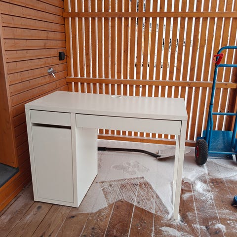 Annetaan kuvanmukainen työpöytä. Käytönjälkiä löytyy ja esimerkiksi kannessa näkyvää mustekynän jälkeä ei ole yritetty sen koommin pestä.