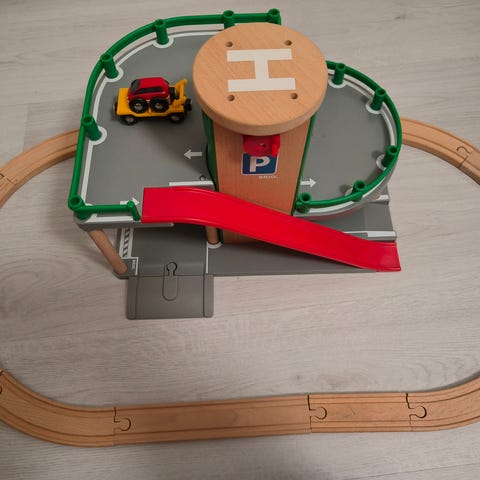 BRIO parkkitalo leikkisetti. Kaksikerroksinen parkkitalo, jossa ajoluiska, pysäköintitasot ja hissi tai ramppi keskiosassa. Yhteensopiva BRIO-junaratojen ja ajoneuvojen kanssa. Valmistettu pääosin puusta ja muovista. Soveltuu lasten leikkeihin autojen ja junien kanssa.