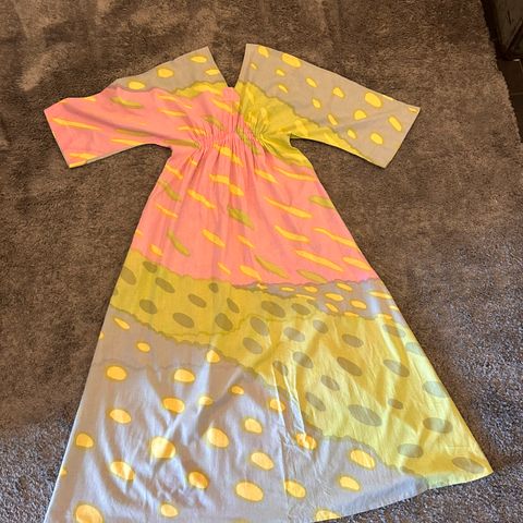 Marimekon mekko 70 - 80-luku. Maija Isolan "Käspaikka" kangas. Valmistettu vielä Suomessa.