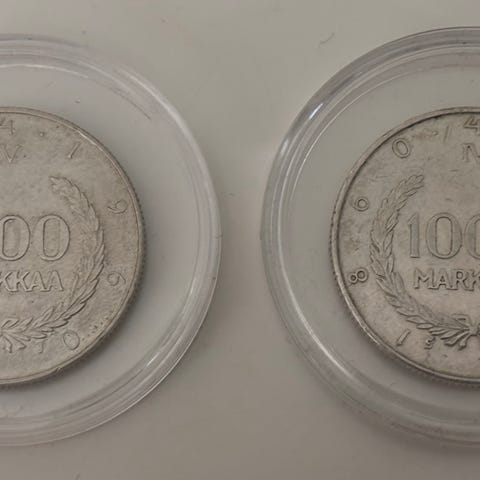 Hopearahat; Olympia 500 mk vuodelta 1952 ja Snellman 1000 mk vuodelta 1960 (huippukuntoinen).