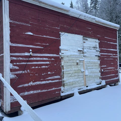 Talli ollut minulla vajaa 2 vuotta, en ole päässyt käyttämään hevosta sisällä. Pintaremppaa kaipaa sinne tänne sisäseiniin. Halutessaan pelkkä levytys mielestäni riittää. Ovet löytyy, mutta vaatinevat vähän nikkarointia, että ne saa oikeaoppisesti kiinni. Saranoilleen ne voi nostaa vaikka heti. Talli kesti noston ihan hyvin silloin, kun ostin, tuskin on muuttunut miksikään. Lepää isojen betonipalkkien päällä reilusti irti maasta.
