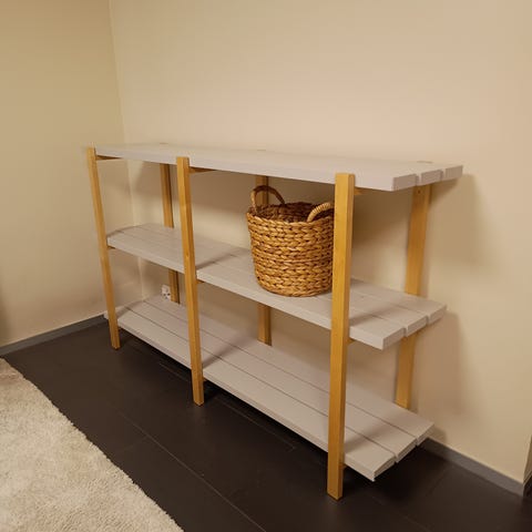 Ikean ja Hayn yhteistyömalliston hyllykkö. Jalat massiivi koivua ja tasot metallia.
