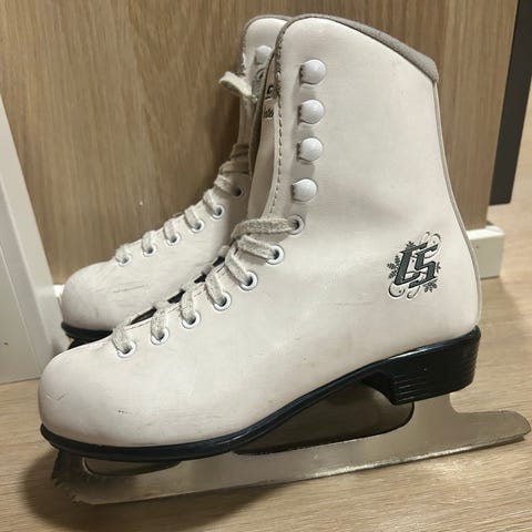 J. Figure skate lasten taitoluistimet, koko 34. Väri valkoinen. Perinteinen nauhakiinnitys.