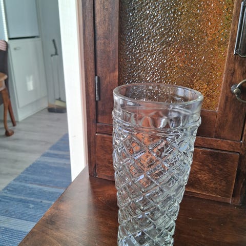 - Turkoosi maljakko, mallista ei tietoa. Pohjassa Riihimäen lasin merkki ja 1388? Korkeus 18cm. Särö reunassa ja käytönjälkiä.