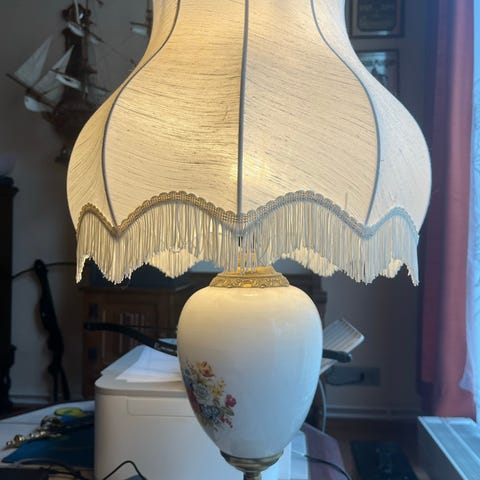 Kuvissa Stockmannin varjostin, ei ole alkuperäinen eli varjostin on jossain vaiheessa vaihdettu (80/90-luvulla). Nyt kun lampun korkealta tasolta alas otin, huomasin, että varjostimen muovitettu osa rikki kuten myös 'metalliosakin' - halutessa nämä saa kyllä mukaan.