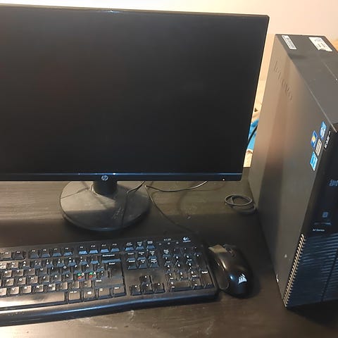 Myös vanha näyttö, toimii mutta todella vanha. Langallinen, jonka osa näppäimistä vaatii kovempaa painallallusta. Langallinen hiiri.