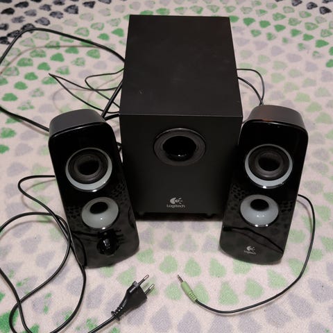 Logitech kaiutinsetti subwooferilla esimerkiksi tietokonekaiuttimiksi. Kaiuttimissa ja subwooferissa pieniä jälkiä/naarmuja.