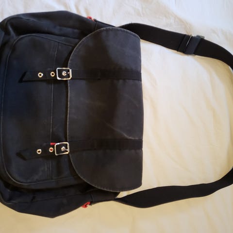Marimekko olkalaukku unisex-käyttöön. Materiaalina kangas, värinä musta punaisin yksityiskohdin. Laukussa on säädettävä olkahihna. Läpässä on hihnakiinnitys ja sisäpuolella vetoketjutasku sekä nappikiinnitys.