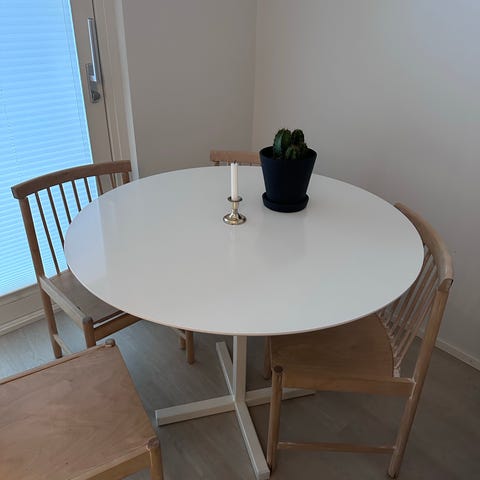 Ruokapöytänä toiminut Ikean pyöreä Docksta-merkkinen pöytä. Pientä kuvissa näkyvää jälkeä, mutta yleisilme edelleen siisti. Pöydän pinta helppo pitää puhtaana.